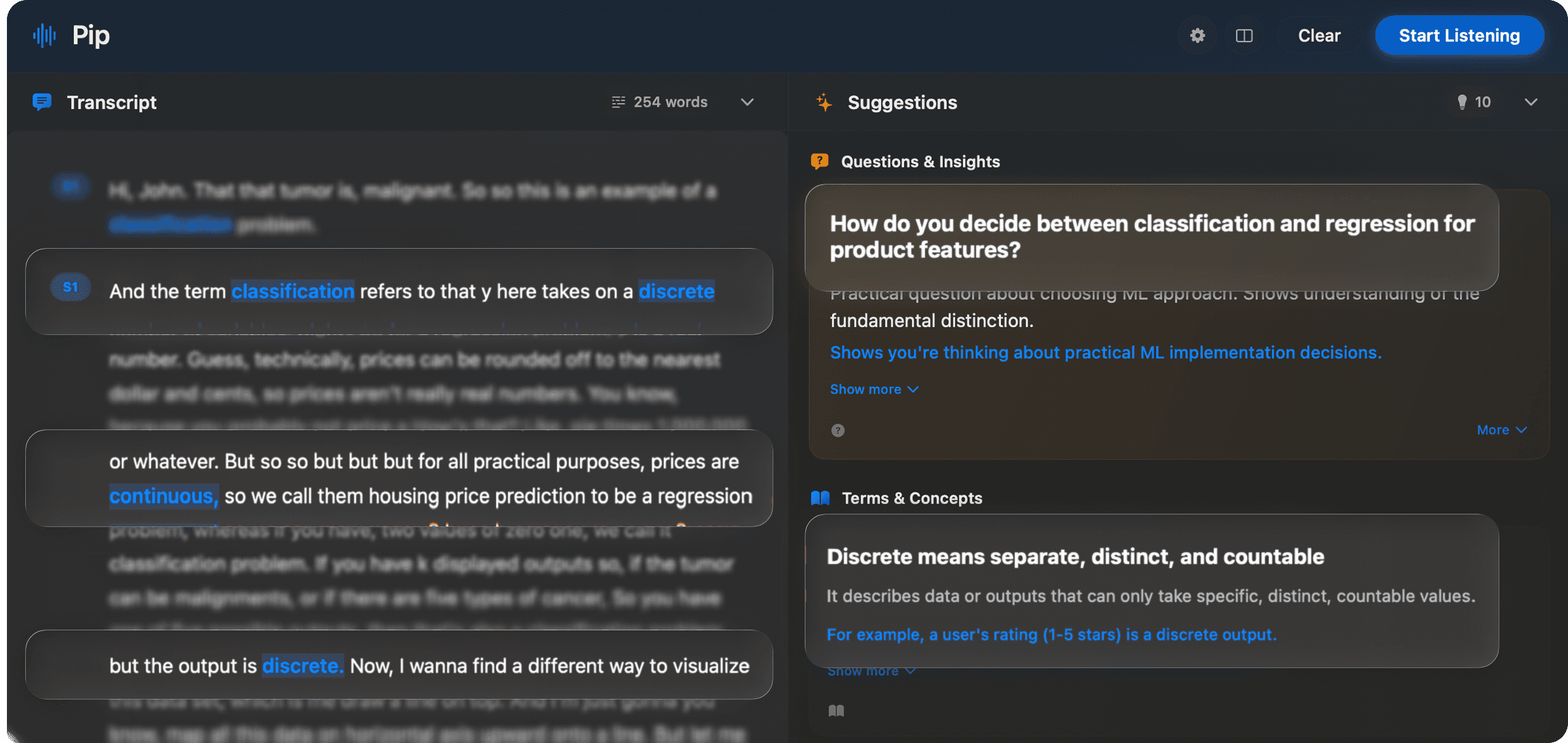 Start any meeting or lecture. Pip gives you real-time context right when you need it.